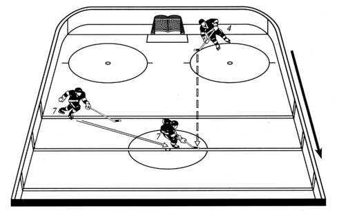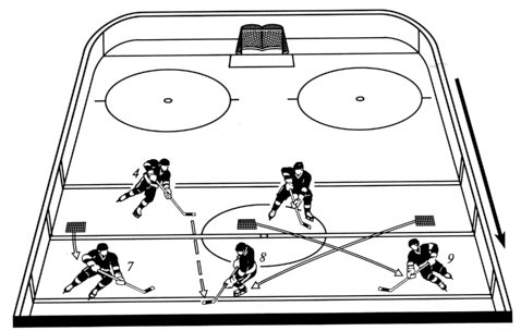 | Командные тактические действия Командные атакующие действия базируются на индивидуальных и групповых и включают в себя контратаку (быстрое нападение) с места отбора шайбы и атаку (постепенное нападение), которые могут переходить в атаку с ходу и позиционное нападение с розыгрышем шайбы в зоне противника. Эффективность атакующих действий зависит от реализации ряда общих методических положений -- принципов, вытекающих из основных тенденций развития современного хоккея (повышение интенсивности, темпа игры, количества и жесткости силовых единоборств, плотности оборонительных построений и др.). Эффективность атакующих действий определяется быстротой перехода от обороны к атаке, когда противник не успевает организовать оборонительные порядки. Атака должна быть скоротечной, что возможно лишь на основе реализации суммы скоростей игроками атакующей команды (скорость маневра, быстрота выполнения передач, приема шайбы и завершающих бросков, оперативность игрового мышления, взаимопонимание партнеров). В атаке принимают участие все полевые игроки. Рациональное использование в атаке каждого игрока, в том числе активное подключение защитников, значительно увеличивает атакующую мощь команды. Очень важно в атаке оптимальное соотношение индивидуальных и коллективных тактических действий, когда игра каждого хоккеиста направлена на решение главных задач команды, и вместе с тем каждому предоставляется возможность принять самостоятельное решение, использовать свои «фамильные» технико-тактические приемы. Атакующие должны быть постоянно нацелены на взятие ворот, для чего нужно находить кратчайшие пути к воротам противника, активно использовать добивания, подправления и помехи вратарю. Контратака Как уже отмечалось, эффективность атакующих действий во многом зависит от быстрого перехода от обороны к атаке. Атакующие действия начинаются сразу после отбора шайбы в любой зоне хоккейной площадки. Поэтому очень важно, чтобы в построении обороны были предусмотрены возможные варианты выхода в контратаку. Первоочередная задача организации контратаки заключается в создании численного превосходства атакующих у ворот противника. Это возможно при условии выполнения своевременной и точной продольной или диагональной передачи (первого паса), отыгрывающей ряд игроков противника. Эффективность такого паса во многом зависит от игрока, владеющего шайбой, и трех-четырех открывающихся. Для этого игрок, овладевший шайбой в отборе, должен быстро «оторваться» от соперника, перейти в движение лицом к его воротам, быстро оценить обстановку и отдать нацеленный пас одному из открывшихся партнеров. Контратака может проводиться во всех трех зонах: зоне защиты, средней зоне и зоне нападения. В своем движении из зоны защиты она имеет выраженные три фазы: 1) организация или начало контратаки, определяемое с момента отбора шайбы и начала организованных действий по выходу из зоны; 2) развитие атаки, т. е. прохождение средней зоны и организованный вход в зону нападения; 3) завершение атаки — действия, непосредственно направленные на взятие ворот (острые передачи, броски, удары,добивания, подправления, обводка). Естественно, в контратаках из средней зоны, и особенно из зоны нападения, фаза развития атакующих действий будет зна¬чительно меньше по врем