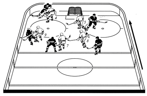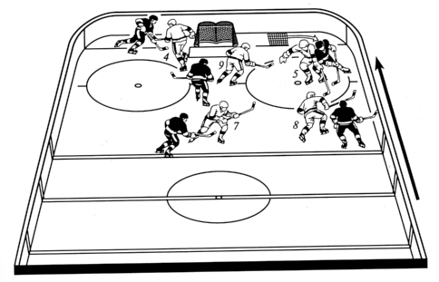 Отбор шайбы в зоне защиты Зонная защита — наиболее распространенная система отбора в мировом хоккее. Ее часто используют канадцы. Она экономична, дает неплохой результат при умении хоккеистов ловить шайбу на себя, хорошо взаимодействовать с партнерами. Нахождение нападающих на активных позициях предоставляет хорошие возможности для контратаки. Основной недостаток этой обороны — пассивность в отборе, что позволяет противнику долго находиться в зоне с шайбой, беспрепятственно контролируя ее на боковом и лицевом бортах и в углах площадки. Владеющего шайбой соперника атакует защитник 4, стремясь отобрать ее. Основная его задача — не дать обыграть себя. Защитник 5 контролирует зону перед воротами и плотно опекает противника, находящегося в этой зоне. Центральный нападающий 9 контролирует зону среднего «пятачка» и плотно опекает в ней соперника. Правый крайний нападающий контролирует свою зону, опекает защитника противника и помогает защитнику 4 в отборе. Левый крайний нападающий 8 контролирует свою зону, опекает другого защитника, при необходимости помогает в отборе центральному нападающему 9 и защитнику 5. При перемещениях противника игроки не идут за атакующими, а передают их друг другу, придерживаясь своей зоны. При переводе шайбы на противоположный фланг соответственно изменяются действия обороняющихся. Игроки не идут опрометчиво на борт и в углы, а отбирают шайбу при явной угрозе воротам с голевых позиций. Персональная защита осуществляется по принципу игры «каждый с каждым». Она наиболее активна в отборе шайбы, заставляет нападающих противника много двигаться, постоянно открываться, выполнять обводку при дефиците времени, что способствует увеличению темпа игры и повышает вероятность потери шайбы противником. Кроме этого, персональная оборона предполагает увеличение контактности, применение силовых воздействий клюшкой и туловищем к игроку, владеющему шайбой или принимающему передачу. Активные оборонительные позиции способствуют созданию реальных возможностей для выполнения контратаки в случае отбора шайбы. Вместе с тем в этом виде обороны несколько принижаются коллективные взаимодействия, роль позиционной игры, страховка, переключения. Персональная оборона требует от игроков высокого уровня физической и технической подготовленности, скоростного маневра, жесткости в силовых единоборствах, собранности, внимания. Ее слабым местом является то, что проигрыш хотя бы одним игроком единоборства нарушает всю систему обороны и может привести к взятию ворот. При переходе соперника на позиционное нападение защитник 4 выходит на игрока соперника, владеющего шайбой, и начинает его плотно опекать. Защитник 5 берет под опеку крайнего нападающего, центральный нападающий 9 — центрального нападающего противника, а крайние нападающие 7 и 8 плотно опекают защитников. С момента разбора и взятия под опеку игроков противника они постоянно осуществляют их плотную опеку, везде следуют за ними, куда бы они ни смещались, в том числе при перемещении игрока с шайбой на противоположный фланг, при выполнении скрещивания и заслонов. Передавать своих подопечных друг другу можно лишь в порядке исключения — при высоком уровне взаимопонимания обороняющихся. Чтобы отбор был более результативным, следует увеличивать его активность